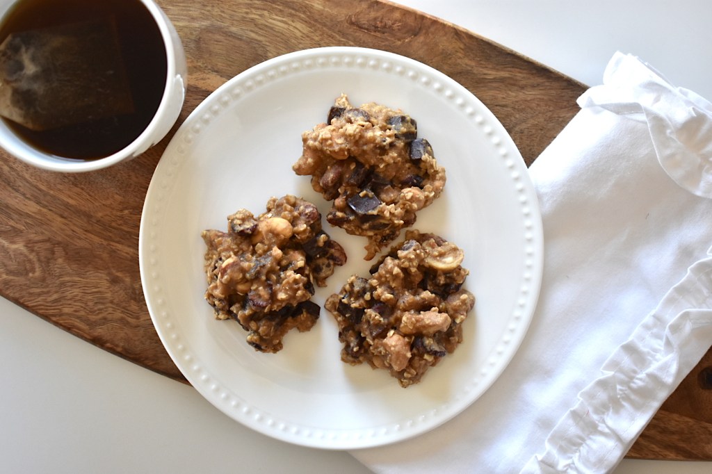 Line two cookie sheets with parchment paper. Using a spoon, scoop spoonfuls of batter onto the cookie trays. The batter is chunky so don’t expect perfectly formed cookies. Keep scooping out mounds of batter until you have 20-22 medium-sized cookies. You may need to use your hands to help the cookies take shape — don’t be afraid to get your hands a little gooey here.