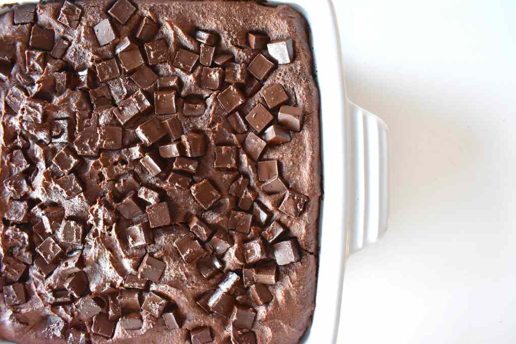 Grease an 8×8 inch baking dish with coconut oil. Pour the batter into the dish and spread it out evenly using the back of a spoon. Sprinkle your second cup of chocolate chips on top of the brownies.