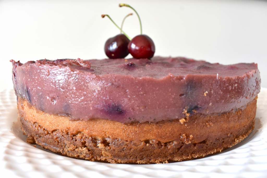 Once the crust and filling are out of the oven, pour the cherry topping overtop smoothing it out evenly. Place the springform pan into the fridge and let cool for 6-8 hours. Once cool, use a butter knife to gently go around the outside of the cake to make sure it’s not sticking to the sides of the springform pan. Then, remove the sides of the springform pan, put the cake on a serving plate, and serve with fresh cherries.