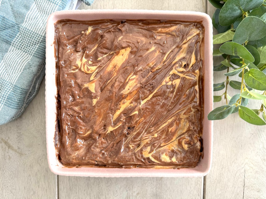 Once removed from the oven, drizzle a little bit of natural peanut butter on top. Using a knife, swirl the peanut butter + melted chocolate chips around to create a pattern. Keep spreading out the peanut butter and chocolate chips until the top of the brownies are completely coated.