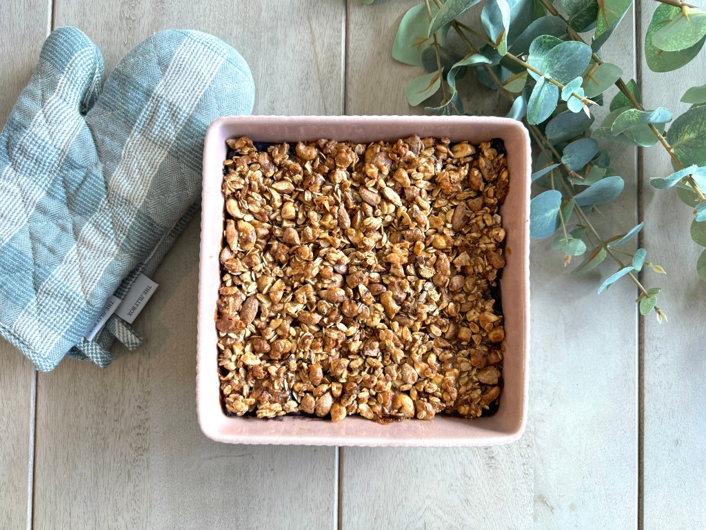 Place your baking dish into the oven, set the oven to 350 degrees Fahrenheit (no need to preheat), and bake for 20-25 minutes. The crumble is ready when the top is nicely browned, and the blueberries are bubbling at the edges.